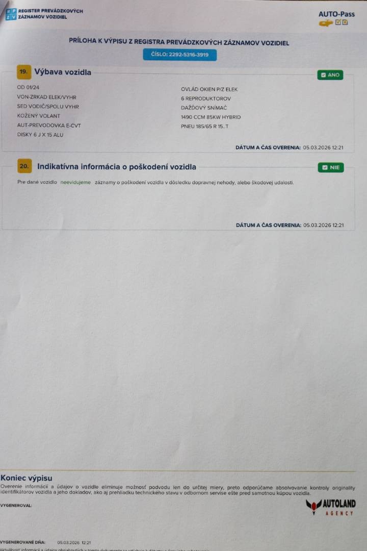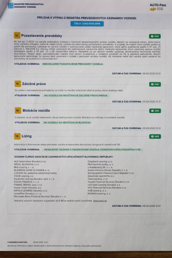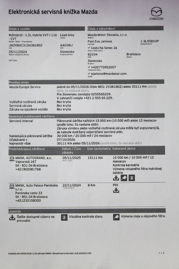 Pravidelne servisované výhradne v autorizovanom servise po posledné km, doložený kompletný výpis z elektronickej servisnej histórie, ktorý je možné overiť priamo u autorizovaného predajcu | V dátume 05.11.2025 pri nájazde 15.111 km bol na vozidle vykonaný posledný servis v autorizovanom servise, pri ktorom bol vymenený Motorový olej, Olejový filter a vykonaná celková kontrola vozidla