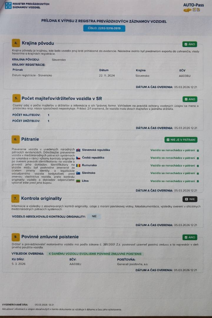 Všetky povlakové vrstvy vrátane A,B,C stĺpikov sú vo výrobných hodnotách, možnosť skontrolovať pri obhliadke | Vozidlo nebolo havarované