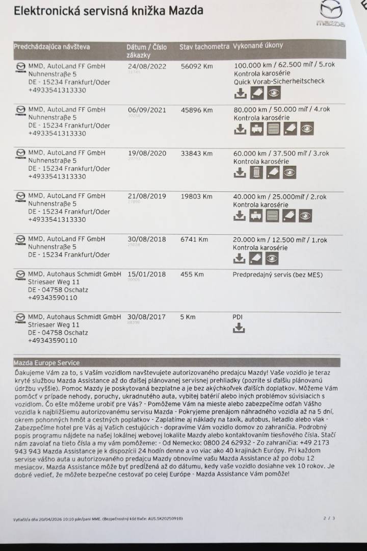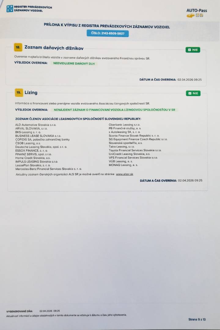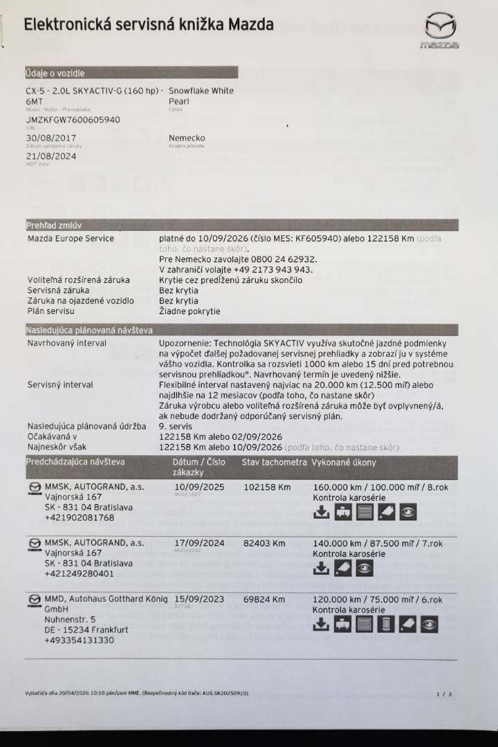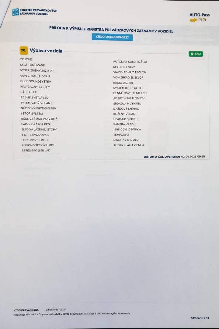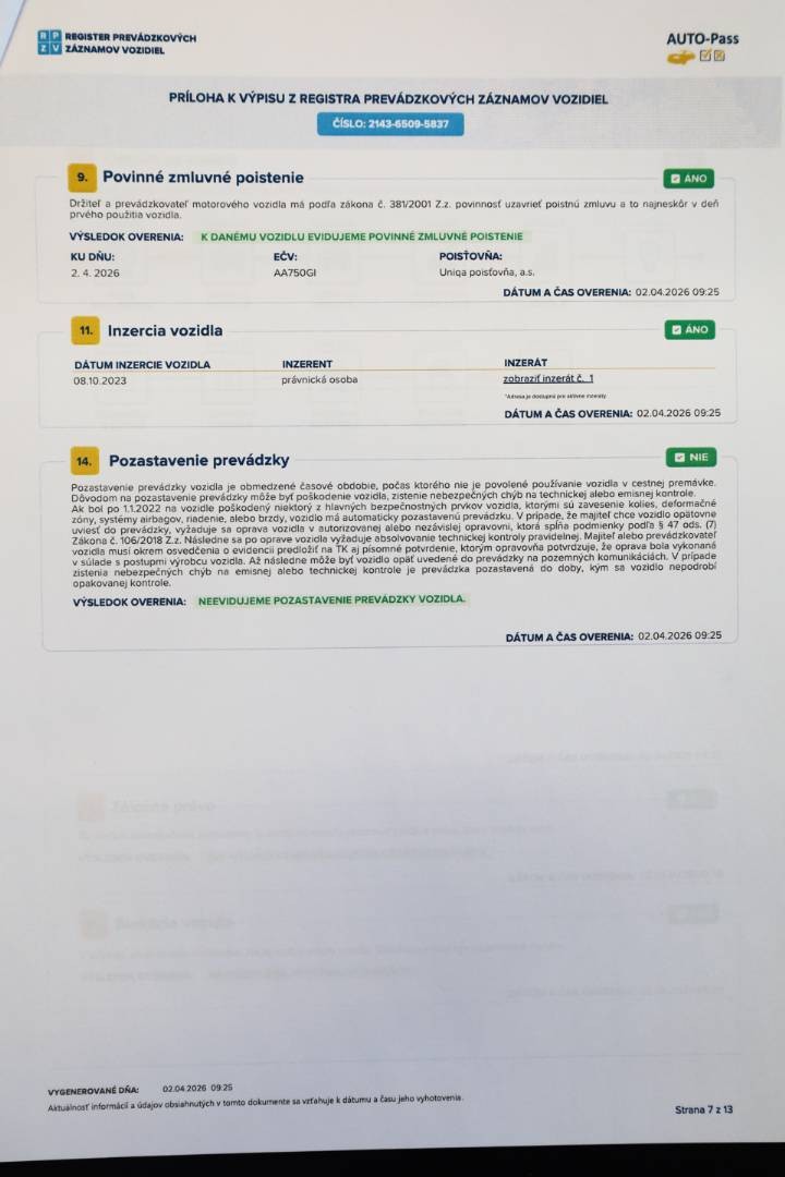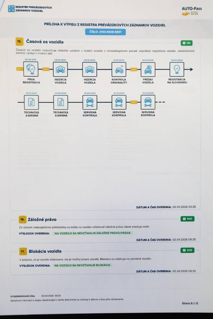 Pravidelne servisované výhradne v autorizovanom servise po posledné km, doložený kompletný výpis z elektronickej servisnej histórie, ktorý je možné overiť priamo u autorizovaného predajcu | V dátume 10.09.2025 pri nájazde 102.158 km bol na vozidle vykonaný posledný servis v autorizovanom servise, pri ktorom bol vymenený Motorový olej, Olejový a Peľový filter, Brzdová kvapalina a vykonaná celková kontrola vozidla