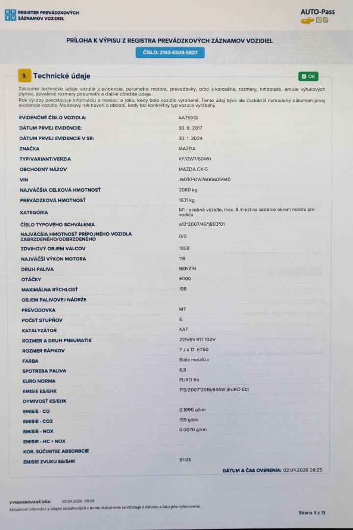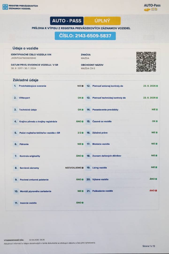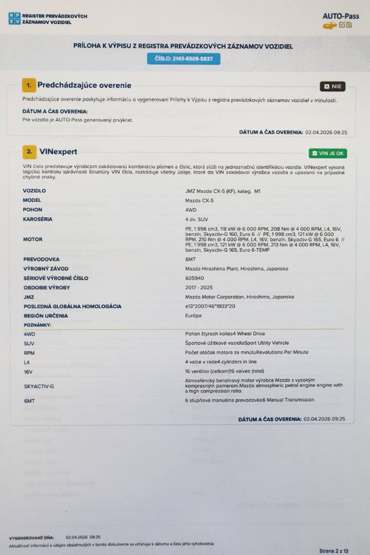 Možnosť samostatného preverenia histórie vozidla cez VIN číslo: JMZKFGW7600605940