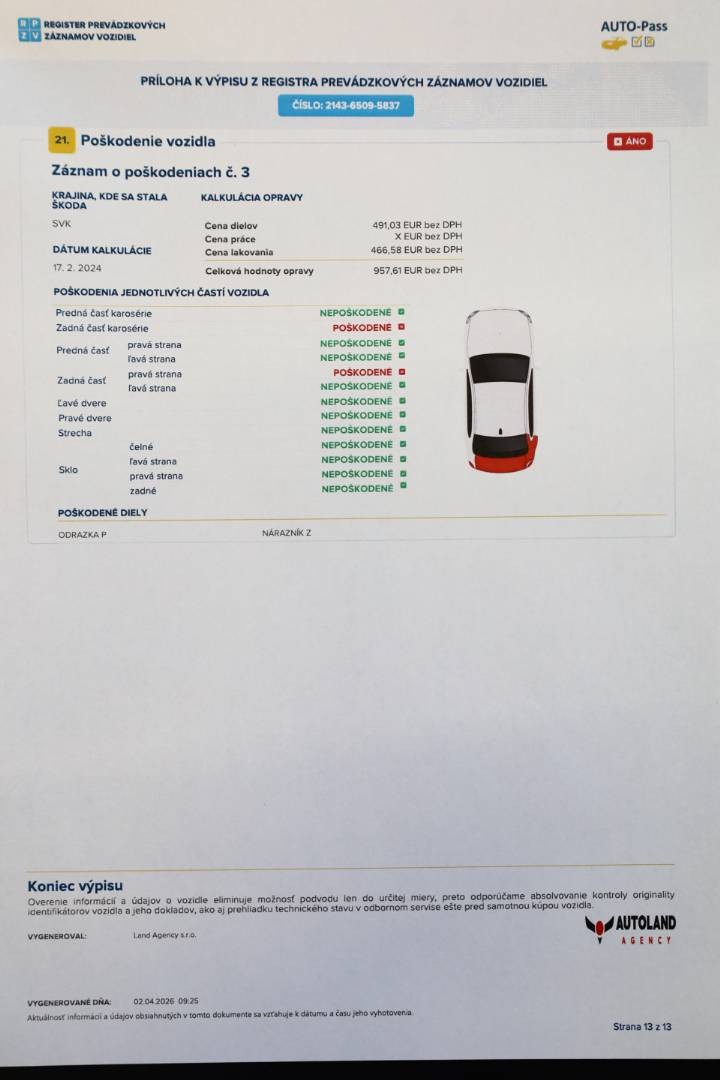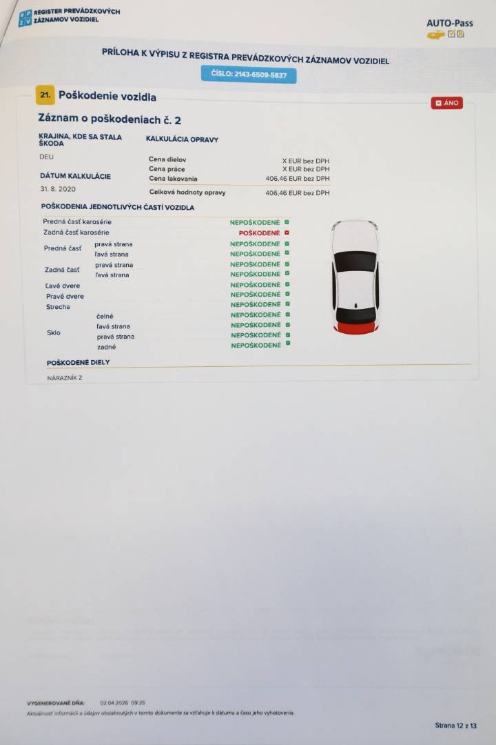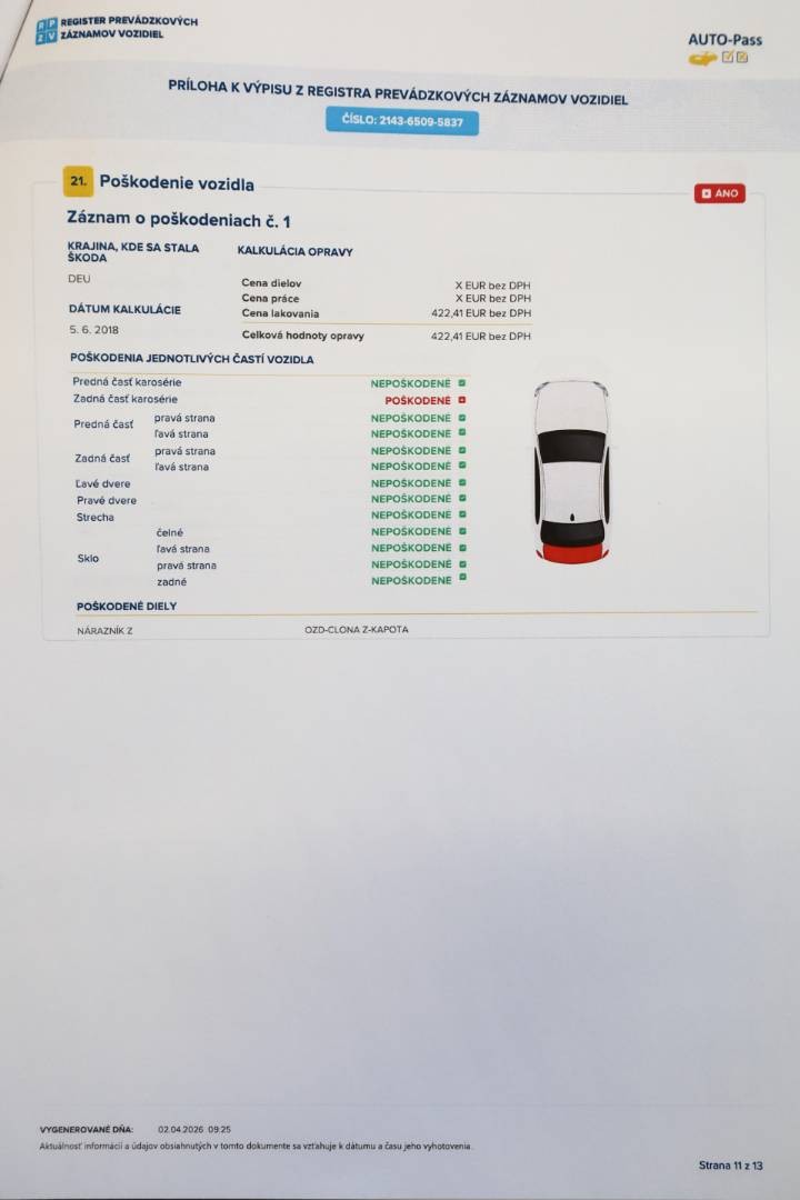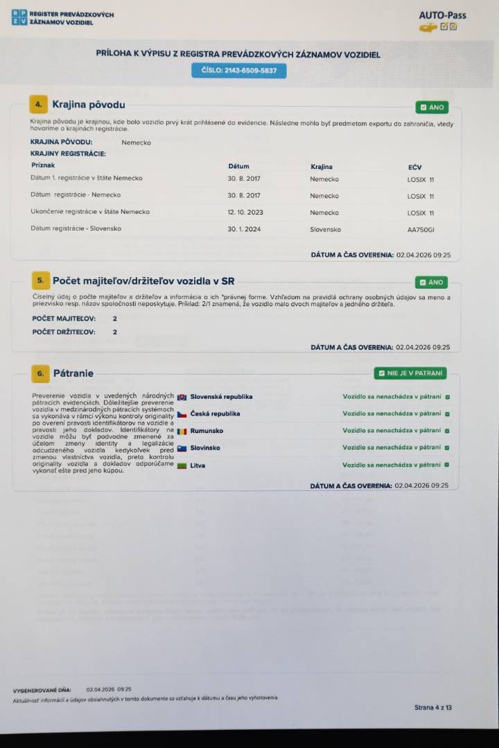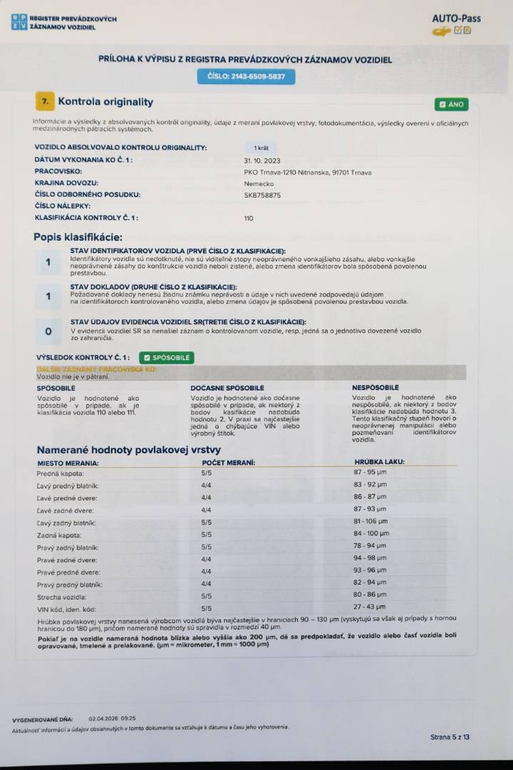 Všetky povlakové vrstvy vrátane A,B,C stĺpikov sú vo výrobných hodnotách, možnosť skontrolovať pri obhliadke
