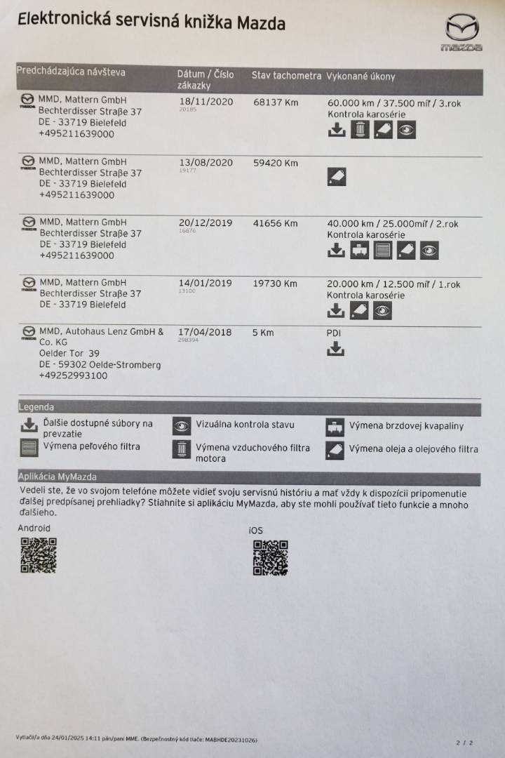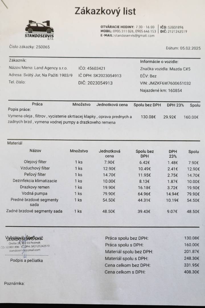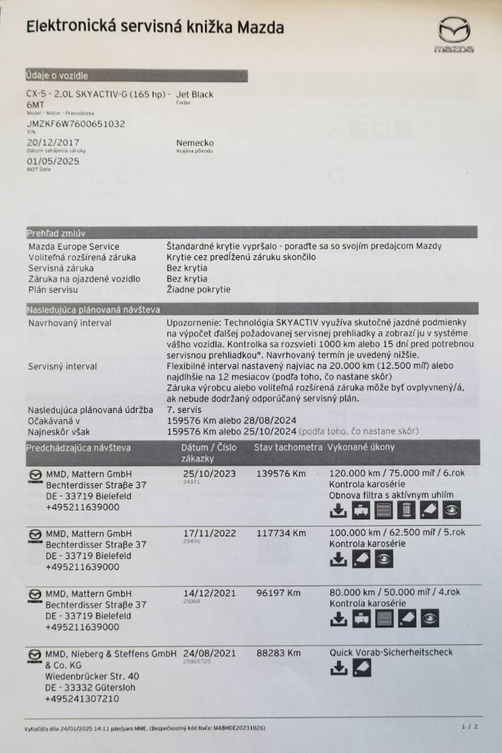 Pravidelne servisované výhradne v autorizovanom servise po nájazd 139.576 km, doložený výpis z elektronickej servisnej histórie, ktorý je možné overiť priamo u autorizovaného predajcu | Následne servisované v neautorizovanom servise po posledné km | V dátume 05.02.2025 pri nájazde 160.854 km bol na vozidle vykonaný servis v kvalitnom neautorizovanom servise, pri ktorom bol vymenený Motorový olej, Olejový, Vzduchový a Peľový filter, Klinový remeň, Vodná pumpa, Predné a zadné brzdové obloženia a vykonaná celková kontrola vozidla