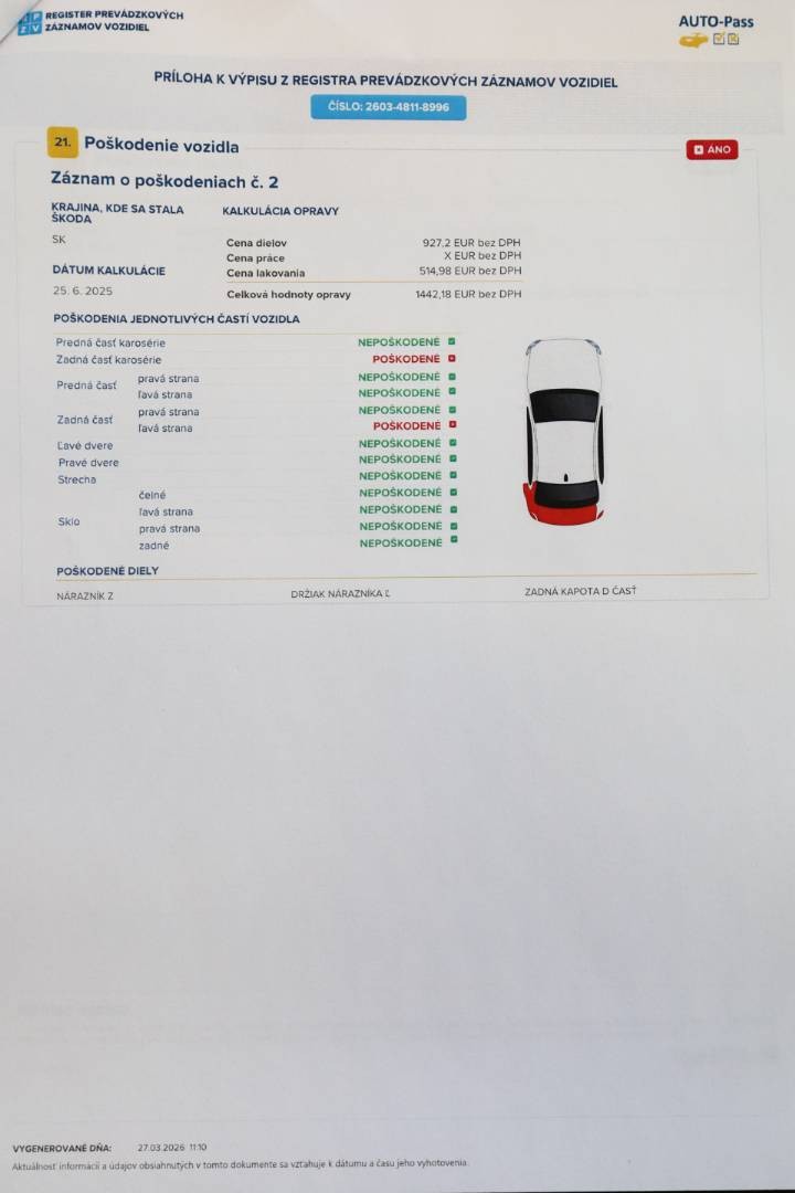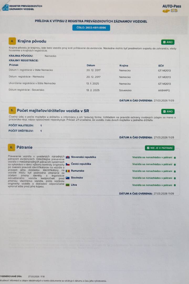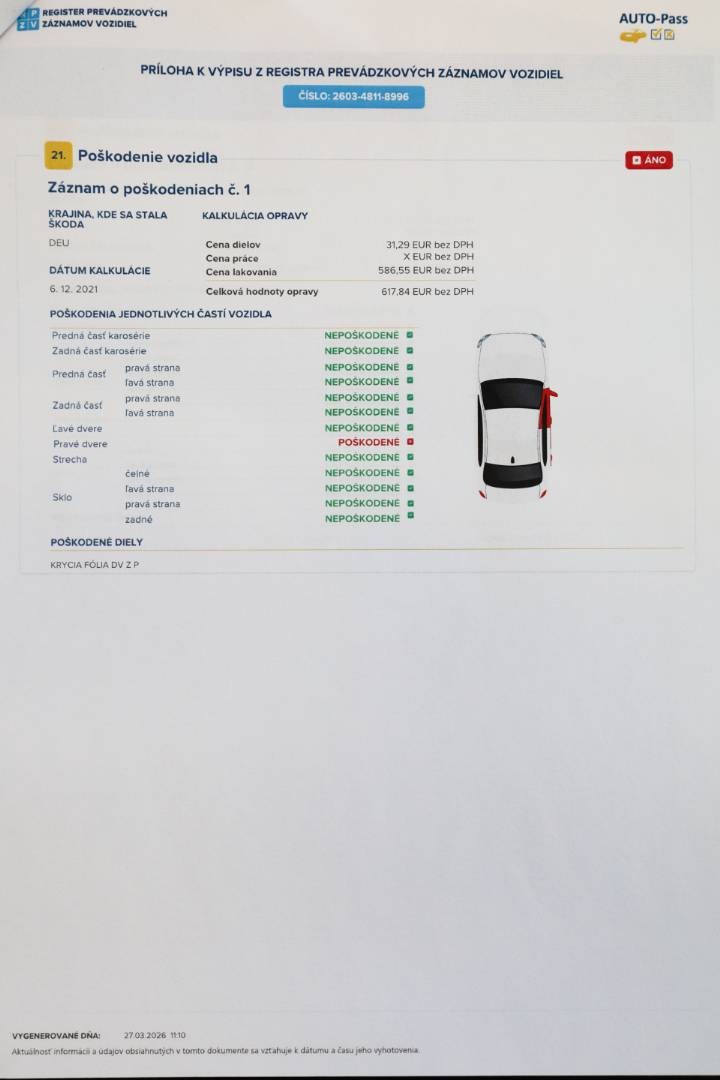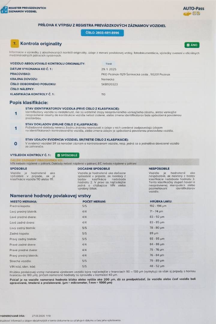 Na vozidle bol v minulosti prelakovaný : Predná kapota (hodnota 230 mikrónov) | Ostatné povlakové vrstvy vrátane A,B,C stĺpikov sú vo výrobných hodnotách, možnosť skontrolovať pri obhliadke